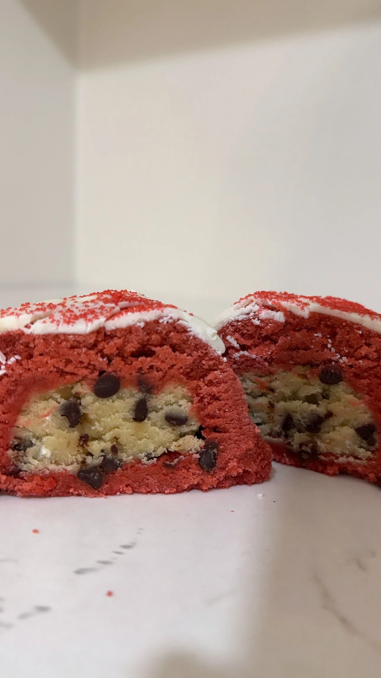 This red velvet cookie hides a surprise inside — a soft, rich chocolate chip cake-pop center baked right into the middle. It’s topped with creamy white chocolate, finished with sparkling sanding sugar, and tastes like something straight out of Santa’s workshop.